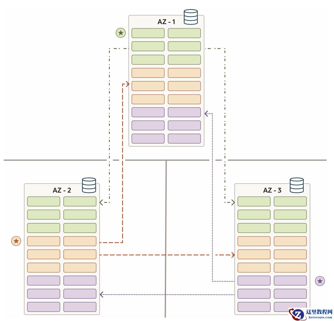 从上面的示例图可以看出,其中有3个AZ区,3个raft replication副本,其中leader和fellower 都位于不同的AZ。