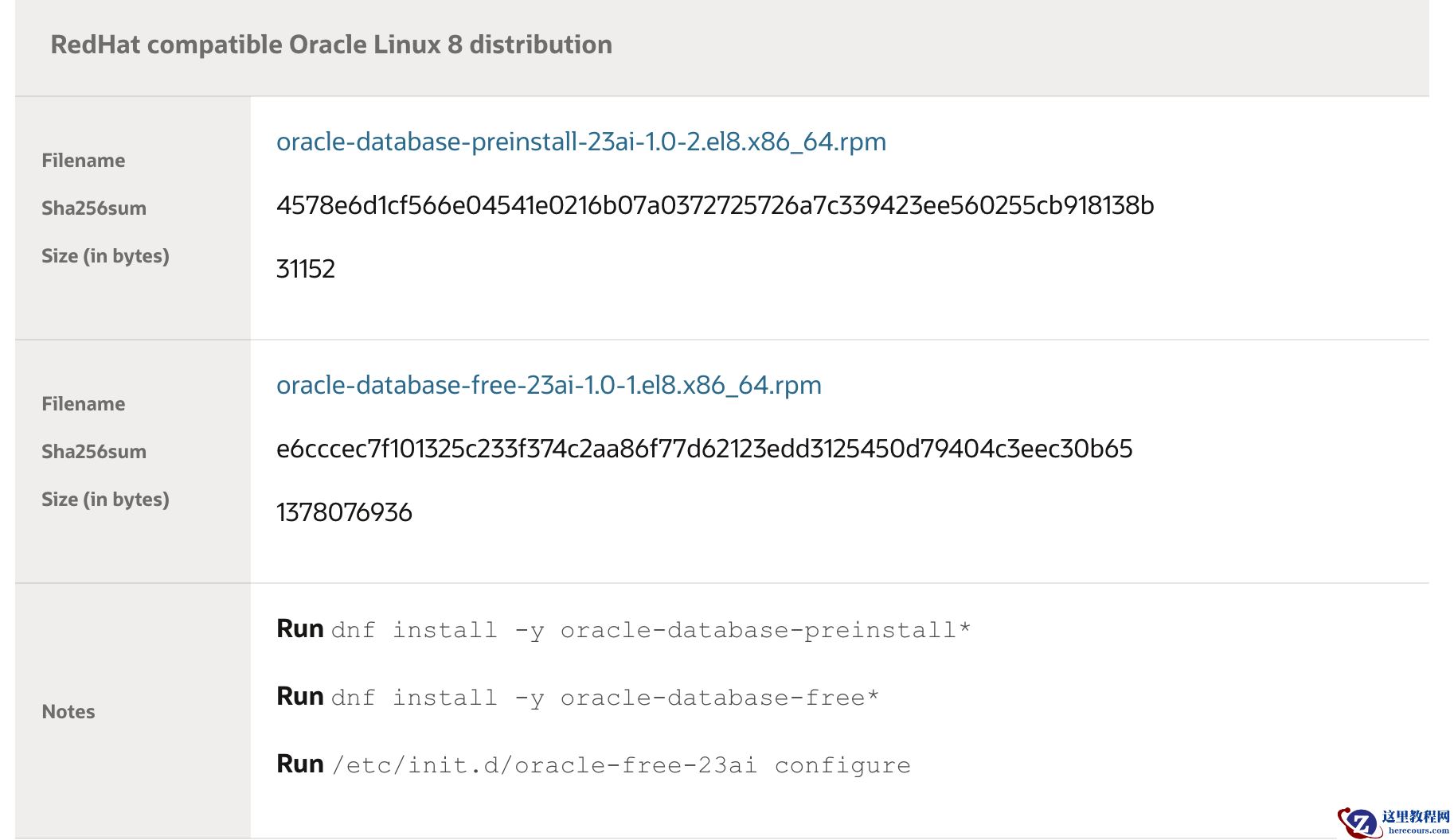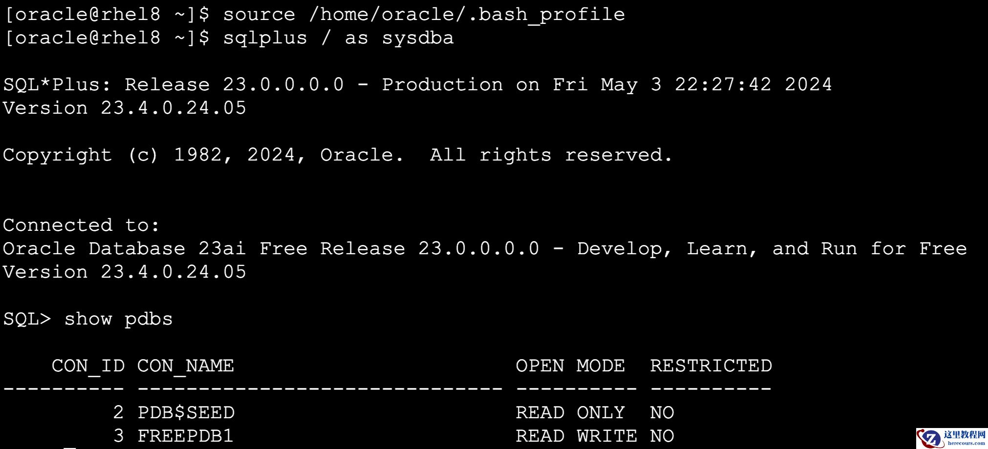 您现在可以下载和试用 Oracle Database 23ai Free: https://www.oracle.com/database/free/get-started 下载 Oracle Database 23ai 支持docker的安装以及rpm的安装部署 我已经通过rpm包安装部署体验了 安装步骤如下 yum install compat* -y yum install ksh -y yum install sysstat -y rpm -ivh oracle-database-preinstall-23ai-1.0-2.el8.x86_64.rpm rpm -ivh oracle-database-free-23ai-1.0-1.el8.x86_64.rpm /etc/init.d/oracle-free-23ai configure Connect to Oracle Database using one of the connect strings: Pluggable database: rhel8/FREEPDB1 Multitenant container database: rhel8 --记得配置环境变量 cat >> /home/oracle/.bash_profile << "EOF" export ORACLE_SID=FREE export ORACLE_HOME=/opt/oracle/product/23ai/dbhomeFree export PATH=$ORACLE_HOME/bin:$PATH EOF source /home/oracle/.bash_profile [oracle@rhel8 ~]$ sqlplus / as sysdba SQL> select sysdate; SYSDATE --------- 03-MAY-24