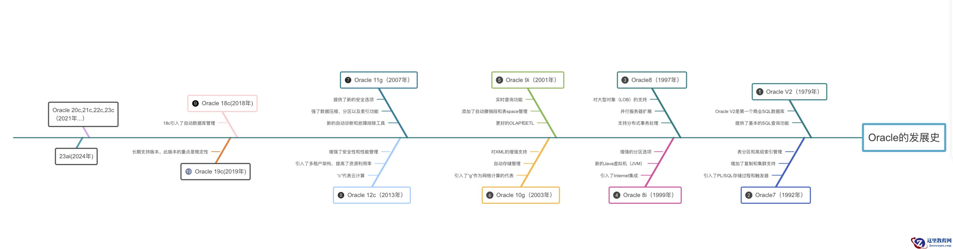 1. Oracle V2(1979年) 关键变化: Oracle V2是第一个商业SQL数据库。 提供了基本的SQL查询功能。 2. Oracle7(1992年) 关键变化: 引入了PL/SQL存储过程和触发器。 增加了复制和集群支持。 表分区和索引管理。 3. Oracle8(1997年) 关键变化: 对大型对象(LOB)的支持。 并行服务器扩展。 支持分布式事务处理。 4. Oracle 8i(1999年) 关键变化: 引入了Internet集成,其中“i”代表Internet。 新的Java虚拟机(JVM)。 增强的分区选项。 5. Oracle 9i(2001年) 关键变化: 实时查询功能。 添加了自动撤销段和表space管理。 更好的OLAP(在线分析处理)和ETL(提取、转换、加载)工具。 6. Oracle 10g(2003年) 关键变化: 引入了“g”作为网格计算的代表。 自动存储管理。 对XML的增强支持。 7. Oracle 11g(2007年) 关键变化: 提供了新的安全选项。 增强了数据压缩、分区以及索引功能。 新的自动诊断和故障排除工具。 8. Oracle 12c(2013年) 关键变化: “c”代表云计算。 引入了多租户架构,提高了资源利用率。 增强了安全性和性能管理。 9. Oracle 18c和19c(2018年、2019年) 关键变化: 进一步推进了自动化和人工智能。 18c引入了自动数据库管理。 19c提供了长期支持,并修复了许多错误。 10.Oracle 20c,21c,22c,23c(2021年...) 2018年之后,Oracle 改变了版本的命名规则 总结: 数据库 8i 9i 10g 11g 12c 18c 19c --数字代表版本号,12.2这个.2是小版本号 i是internet的意思,表明当时是internet互联网盛行的年代。 g是grid,网格运算。为了迎合分布式计算而推出的版本。 c是cloud,云计算的意思。 ai 重点是AI和提高开发人员的工作效率