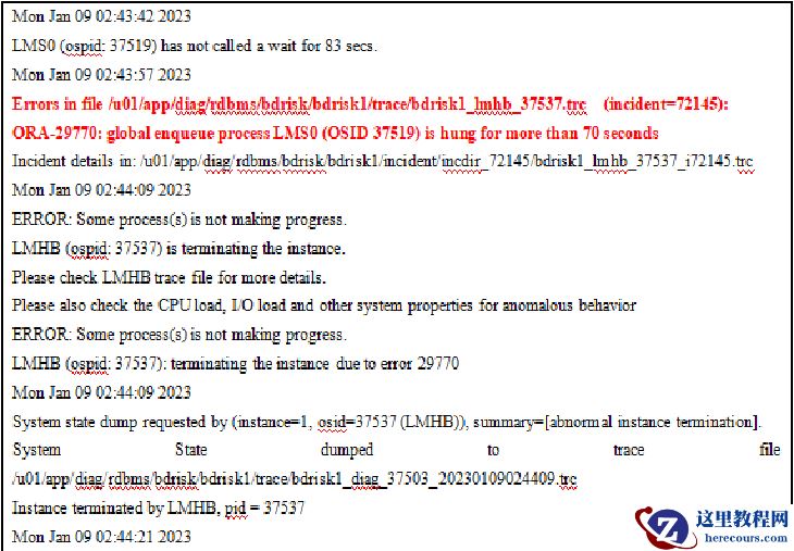 从以上信息看,数据库在正常运行过程中,突然因LMS0进程长时间无法得到响应被LMHB进程监控到后,LMHB进程对实例进行了KILL。