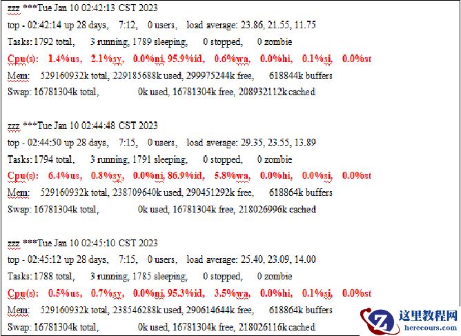 由于故障时间点的OSWatch日志已经被覆盖,考虑到银行业务逻辑相对简单,不存在复杂多变的可能,故障时间节点后一天凌晨2点左右的日志应该同样具有参考性,可以收集OSWatch日志并进行分析。从OSWatch上看,故障时间点的CPU并没有压力,所以可以排除CPU部分的可能。