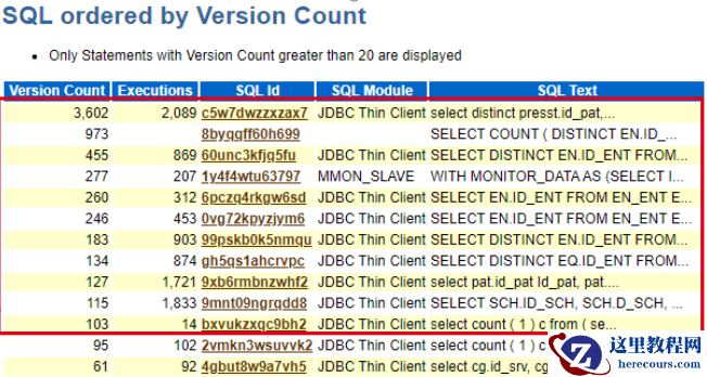 如果子游标是不可共享的,那么就需要创建一个新的子游标(对于 SQL 来说,又增加了一个版本, Version),解析执行计划,然后执行。所以说,version_count 表示这个父游标下子游标的数量。当游标有多个版本时,在sql执行时会查找正确的version,等待的时间就会越来越长,会造成数据库性能问题。部分语句version_count值较高。