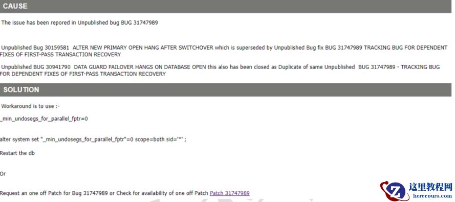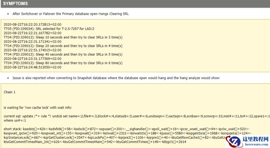 根据该信息查询 MOS(After Switch /Failover Primary Instance Open hangs Because Of SRL Cleanup (Doc ID 2710349.1)