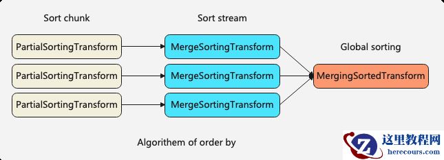 排序算法由3个Transform组成,其中1) PartialSortingTransform对单个Chunk进行排序;2) MergeSortingTransform对单个stream进行排序;3) MergingSortedTransform合并多个有序的stream进行全局sort-merge排序