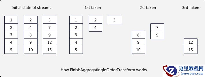 2) FinishAggregatingInOrderTransform将接收到的多个stream内的数据进行重新分组使得输出的chunk间数据是有序的,假设前一个chunk中group by keys最大的一条数据是5,当前即将输出的chunk中没有大于5的数据;