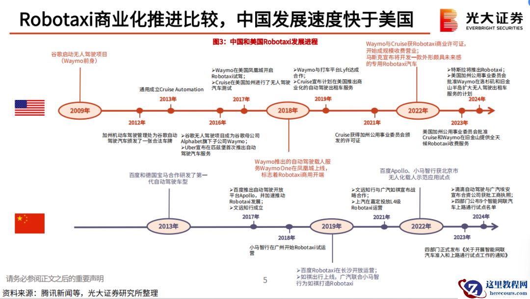图源:工信部官网 其二是在地方性法规层面,7月以来,上海北京两座城市先后迎来重磅消息。上海发放了首批无驾驶人智能网联汽车示范应用许可;北京市经信局就《北京市自动驾驶汽车条例(征求意见稿)》征求意见,明确提出支持自动驾驶汽车用于城市公共电汽车客运、网约车、汽车租赁等城市出行服务。而在此之前,广州、深圳等地,也同样都出·台过类似的管理与促进法规。Robotaxi商业化,得到了一线城市的力推。 政策层面的开放性,凸显了Robotaxi在未来网约出行市场的重要地位。而大方向对了,企业成长就会如鱼得水。 从2021年正式开始Robotaxi开发和商业化算起,如祺出行每年都会在Robotaxi商业化方面取得重要进展。到2023年,它已成为国内首·个以自主研发的Robotaxi车队进行示范运营的出行服务平台。而面对越来越明确的行业机遇,在招股书中,如祺出行展示了自己的决心,明确此次募集资金约有40%将用于自动驾驶及Robotaxi运营服务的研发活动,占比最大。 所以,如祺出行和嘀嗒出行、曹操出行等传统网约车企业相比,出发点并不相同。前者的本质,就是以自动驾驶商业化为目标的科技公司。这次上市,也彻底彰显了如祺出行的独特性。这种独特性,在整个国内自动驾驶市场,都有可圈可点之处。 中美自动驾驶竞赛中已跑出成熟模式 自动驾驶的竞争,是国内企业的技术和商业化比拼,也是大洋两岸顶尖科技公司的一场竞速。 光大证券在研报中指出,中美两国作为Robotaxi发展前沿国家,都已经进入了Robotaxi商业化运营的突破阶段。 其中,中国的商业化进展,相对是更快的。原因在于,国内的Robotaxi玩家借助合作,探索出了更成熟的模式。