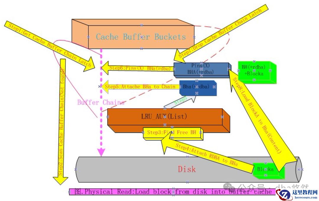 PS:多年前画的,有点粗糙,不过还能用吧。1)Physical%20I/O产生:当搜索内存Hash%20chains没有找到合适的buffer,则必须从disk磁盘读取该block到buffer;2)获取CBC(cache%20buffer%20chain%20latch) latch;3)drop%20latch(cache%20buffer%20chain%20latch),将block读入buffer%20cache,对其他user透明操作;4)在其他user也访问该block的并发场景,加载block到buffer过程:
