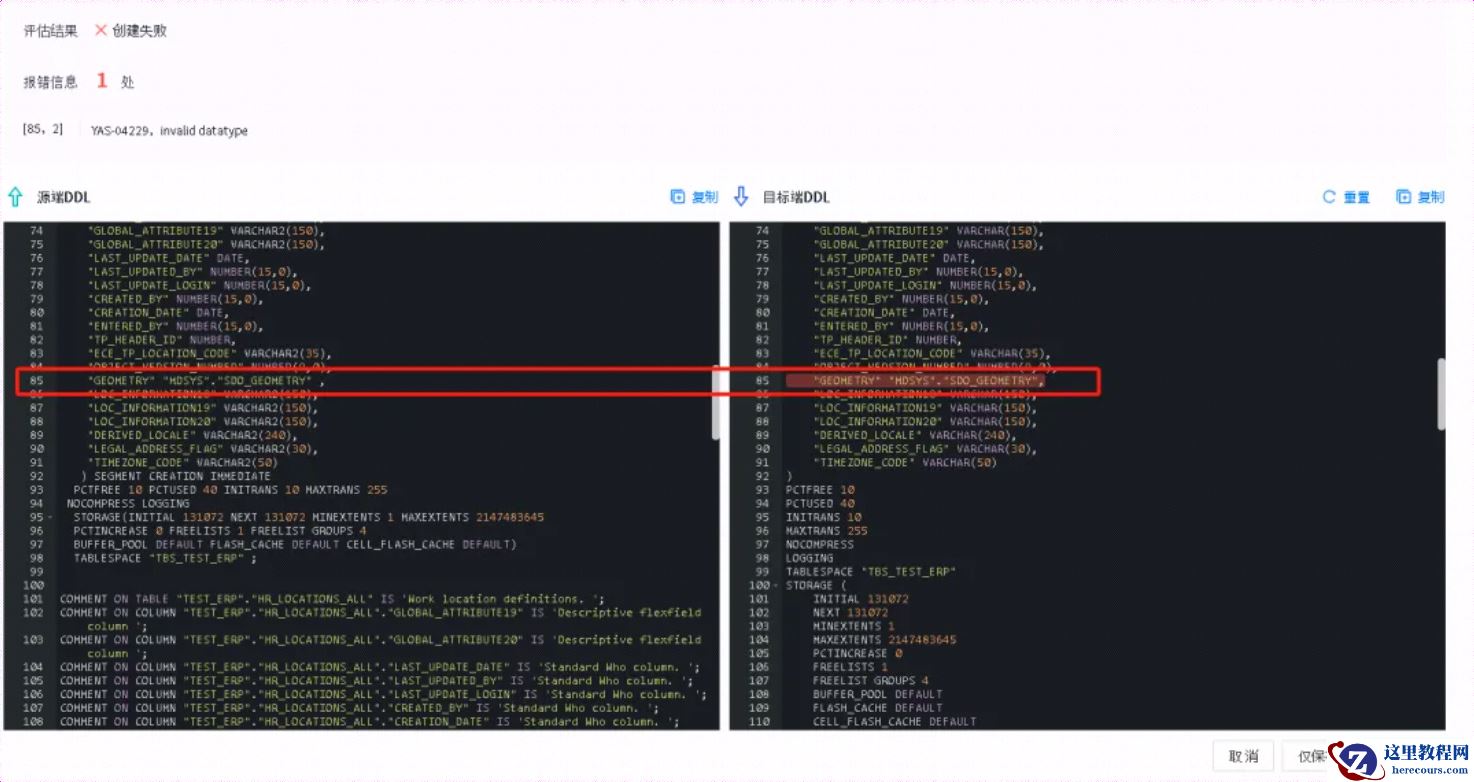 迁移评估过程中遇到无效的数据类型,定位具体的对象类型是SDO_GEOMETRY数据类型,查看了YashanDB官方文档后确认该数据类型目前暂不支持。解决办法是暂时先跳过这个对象。