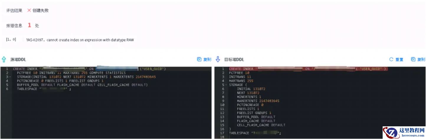 迁移评估过程中遇到不能在RAW数据类型上创建索引问题,登录源库查看USER_GUID字段类型确实为RAW类型,该报错属于功能不支持类型,错误代码为YAS-02097。解决办法是暂时先不创建这个索引。