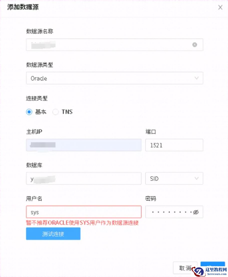 创建数据源过程中遇到Oracle数据库SYS不能作为数据源用户进行连接的问题,猜测是基于安全方面进行考虑,故不支持该用户进行创建。