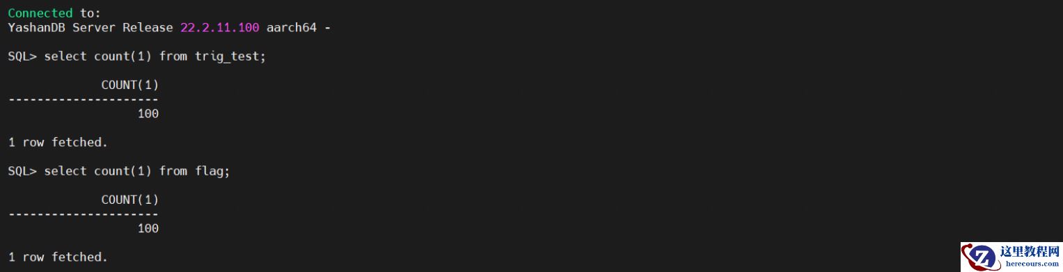 java代码执行完成后,查看flag表中的总数据量,就可以知道触发器被触发了多少次。yashandb的实际结果: