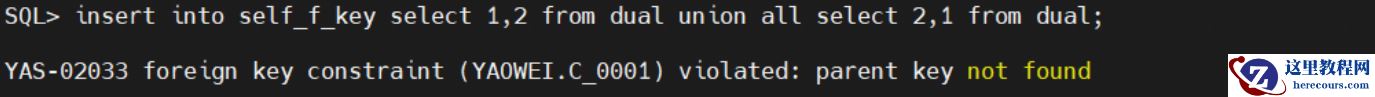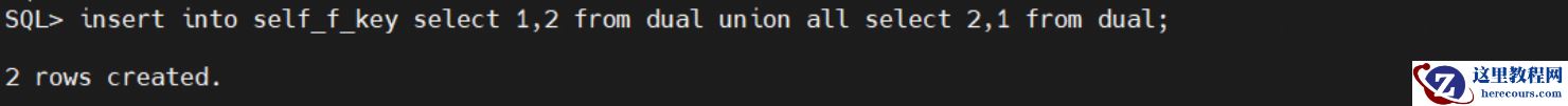 然后使用如下语句,尝试插入两行数据,这两行数据汇总起来,是符合外键关联关系的:insert into self_f_key select 1,2 from dual union all select 2,1 from dual;