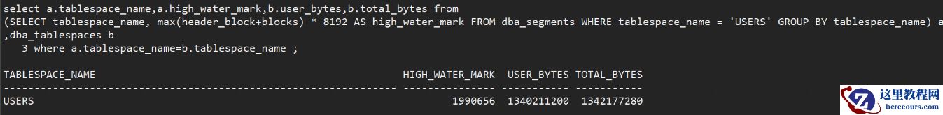 select a.tablespace_name,a.high_water_mark,b.user_bytes,b.total_bytes from (SELECT tablespace_name, max(header_block+blocks) * 8192 AS high_water_mark FROM dba_segments WHERE tablespace_name = 'USERS' GROUP BY tablespace_name) a,dba_tablespaces b where a.tablespace_name=b.tablespace_name ;