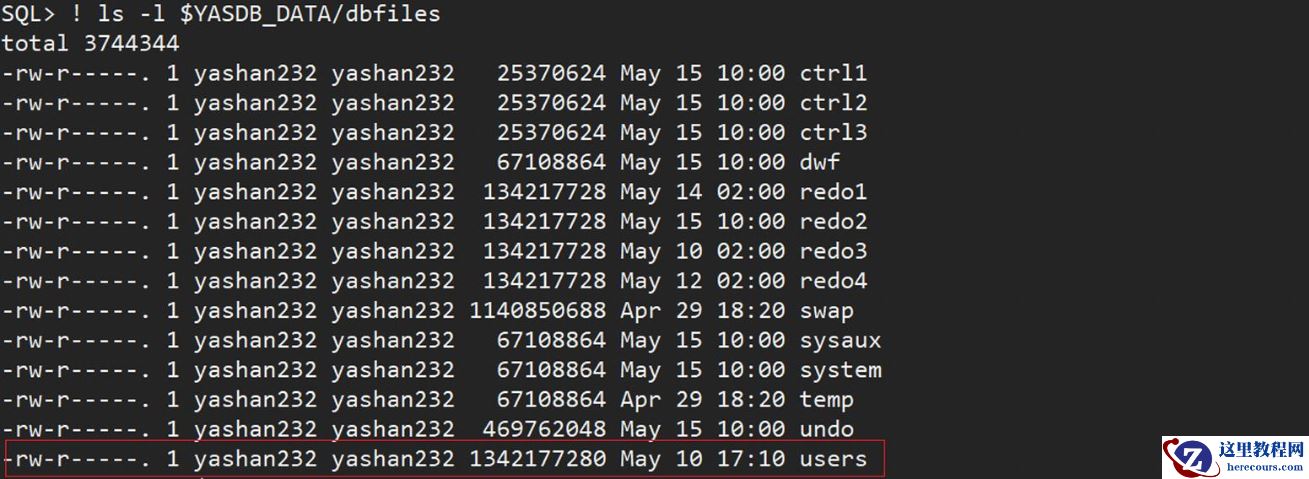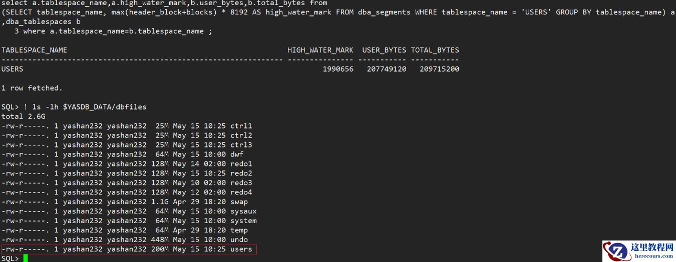 select a.tablespace_name,a.high_water_mark,b.user_bytes,b.total_bytes from (SELECT tablespace_name, max(header_block+blocks) * 8192 AS high_water_mark FROM dba_segments WHERE tablespace_name = 'USERS' GROUP BY tablespace_name) a,dba_tablespaces b where a.tablespace_name=b.tablespace_name ; ! ls -l $YASDB_DATA/dbfiles