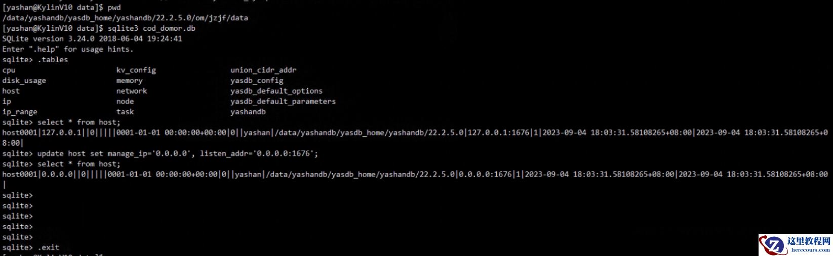 1、sqllite3 cod_domor.db 2、select * from host; 3、update host set manage_ip='0.0.0.0',listen_addr='0.0.0.0:1676';