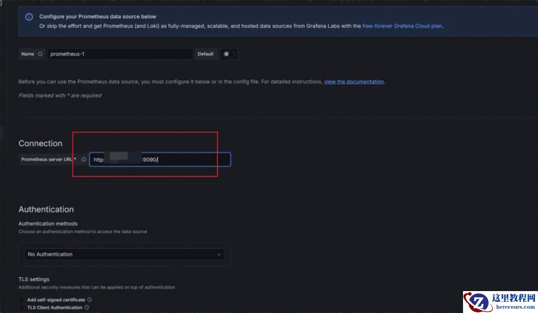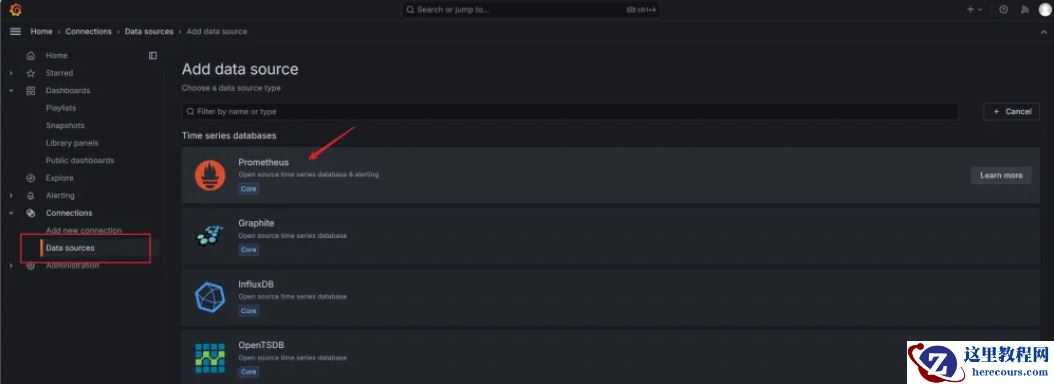 7.配置Grafana Server的数据源,选择Prometheus。根据我们前面的配置,其在9090端口运行: