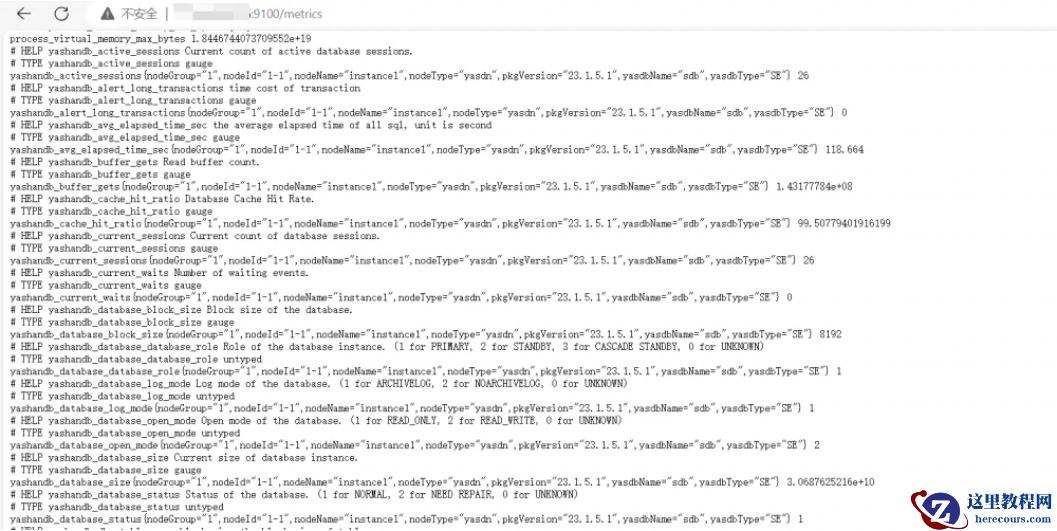 2.然后编辑数据库实例配置文件,设置好数据库地址等信息。接着在9100端口启动YashanDB Exporter,此时访问Metrics接口已经可以看到采集到的数据库信息: