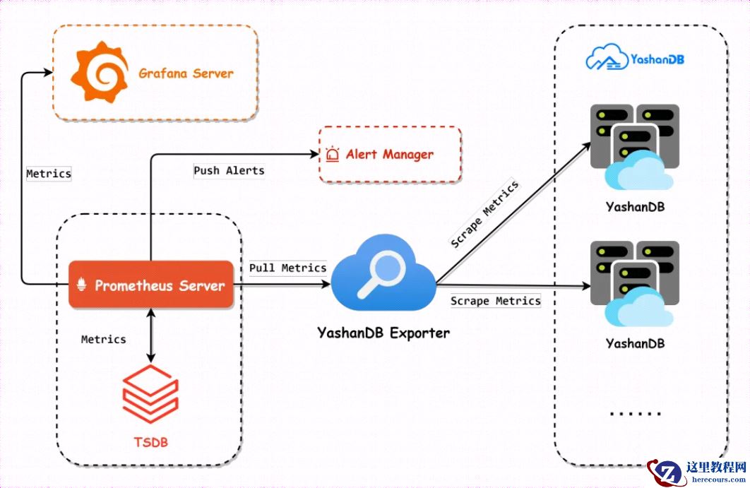基于Prometheus+Grafana监控YashanDB,整体架构设计图如下。其中YashanDB Exporter可以抓取多个数据库实例的监控指标。Prometheus Server通过拉取YashanDB Exporter的Metrics接口,获取指标数据,并将数据存储到其后台时序数据库TSDB中。其他组件的工作流程在上文的背景中已经说明,在此不再赘述。