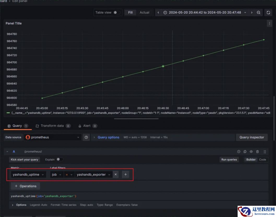 8.添加Dashboard,以监控数据库实例的启动时间(yashandb_uptime)为例: