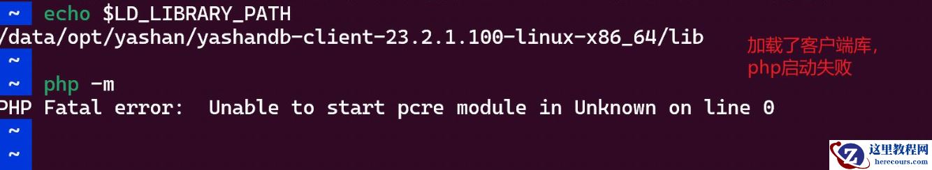 客户将YashanDB的C驱动lib加载到环境变量LD_LIBRARY_PATH后,PHP报错:PHP Fatal error:Unable to start pcre module in Unknown on line 0