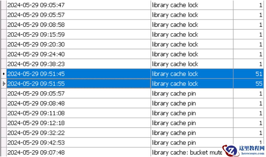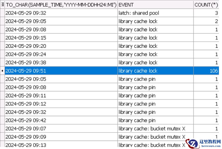 通过对客户反馈的问题时间段 9:49-9:52,将时间点细化到分钟,可以发现在9:51分开始library cache lock在9:51的时候从1个徒增到106个。时间点可以与业务反馈问题时间一致。