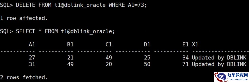 SQL> DELETE FROM t1@dblink_oracle WHERE A1=73;SQL> SELECT * FROM t1@dblink_oracle ;