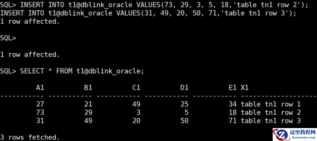 SQL> INSERT INTO t1@dblink_oracle VALUES(73, 29, 3, 5, 18,'table tn1 row 2'); SQL> INSERT INTO t1@dblink_oracle VALUES(31, 49, 20, 50, 71,'table tn1 row 3'); SQL> SELECT * FROM t1@dblink_oracle;