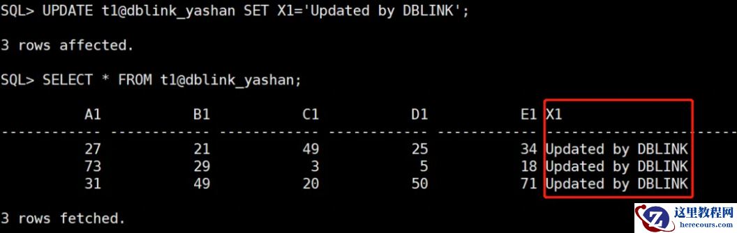 SQL> UPDATE t1@dblink_yashan SET X1='Updated by DBLINK'; SQL> SELECT * FROM t1@dblink_yashan;