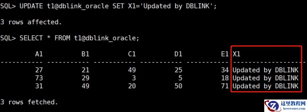 SQL> UPDATE t1@dblink_oracle SET X1='Updated by DBLINK';SQL> SELECT * FROM t1@dblink_oracle;