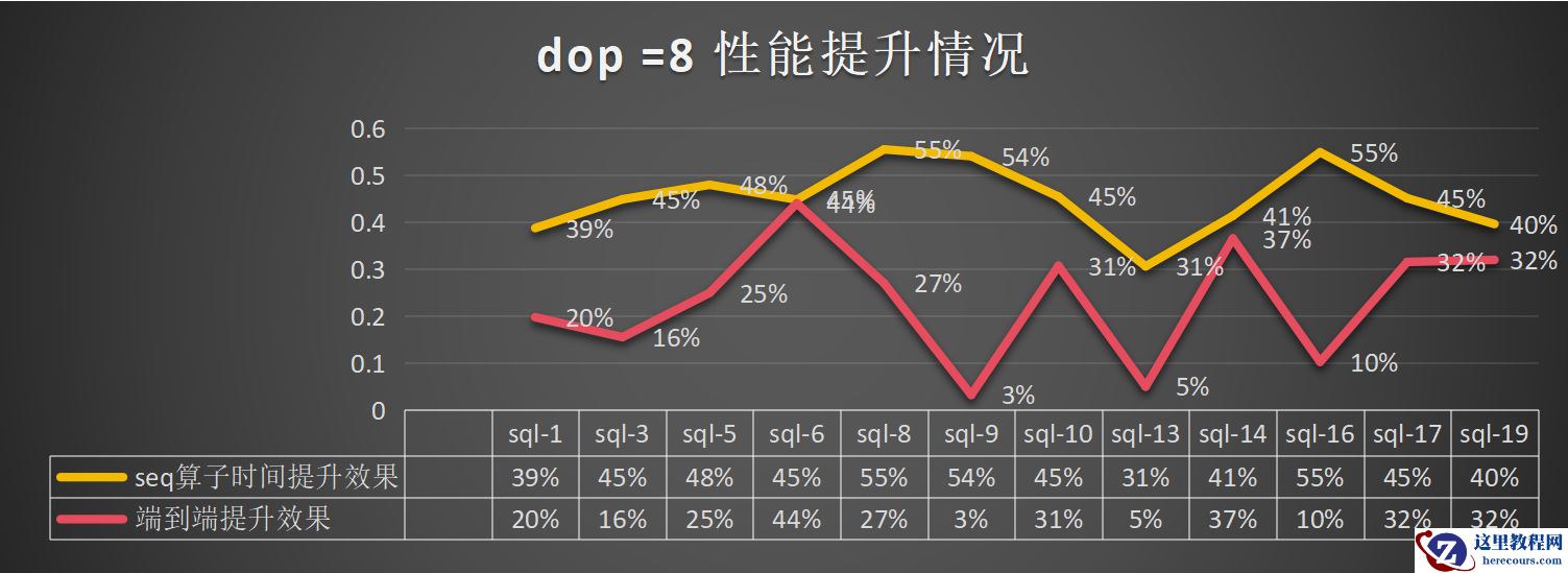 dop=8:总体算子提升为45%,端到端的提升为23%: