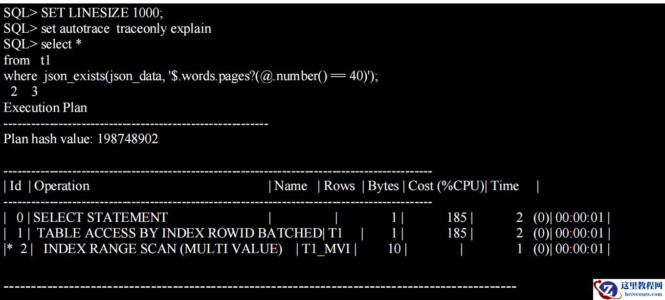 在这里给大家展示一个多值索引 基于多值函数的索引允许我们对存储在 JSON 数据类型中的 JSON 文档中的多个标量值进行索引。 这可以提高包含 JSON_EXISTS 条件的查询的性能。 create multivalue index t1_test on test t (t.json_data.words.pages.number()); 可以看到执行计划中使用了多值索引