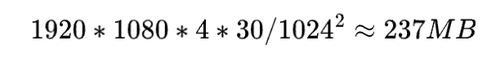 单帧全彩色高清 1920×1080 视频(每像素 4 字节)为 8294400 字节,在帧率 30 的情况下,每秒高清视频将占用 237 MB。