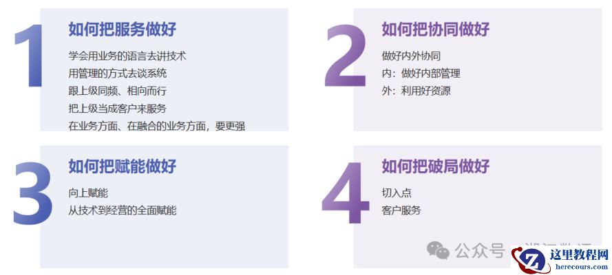 最后我们来简单说一下我们做数据项目如何做好向向上管理,不仅是做数据项目,还是做任何数字化项目,我们都要学会去做向上管理,那么现在大家可能面临的一个问题就是我们的信息部门,特别是CIO,都没有很好找到自己的定位,因为组织定位问题,大家普遍觉得信息部门地位很低,大家过得都很卑微,这就造成我们跟大部分的企业领导聊不上路,没法产生同频共振;同时很多信息部门的同事认为自己一身的技术能力没地方展示,没地方用,自己很想干的事做不了。这是大家目前存在的一个现状。所以这个时候向上管理就非常重要,向上管理不仅仅是说要学会沟通,而且要从服务,协同、赋能和破局这四个方面来做好向上管理。比如说服务,我们都知道,信息部门最大的一个工作职能就是IT服务,除了服务于员工还要服务于领导,所以你要把领导当成客户来服务,要学会用业务语言去讲技术,用技术语言去讲业务,这个是有一定难度的,所以信息部门人员要在业务方面去做深耕,不能因为自己是搞技术的,不去研究业务,做数字化需要的就是融合能力。