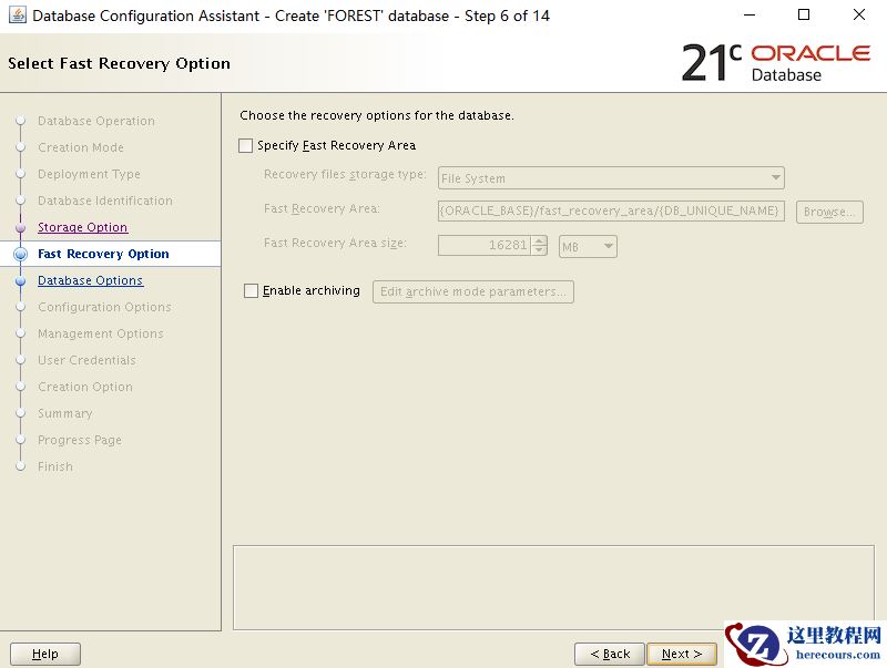 6、指定快速恢复区存储类型、位置和大小,是否启用重做日志归档,默认不开闪回和归档