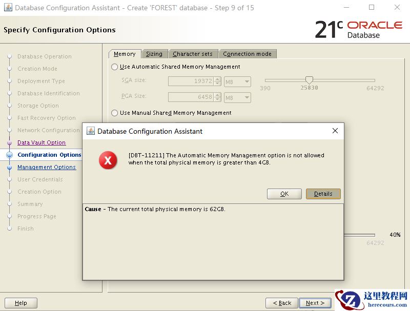 使用ASM管理报错,使用ASM内存管理方式的前提是物理内存不超过4G,当前内存62GB,不满足ASM管理方式。 所以生产环境中都使用ASMM方式进行内存管理
