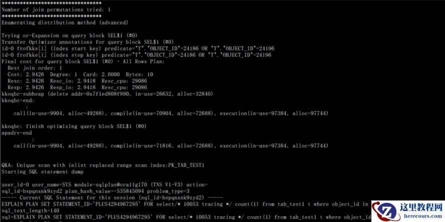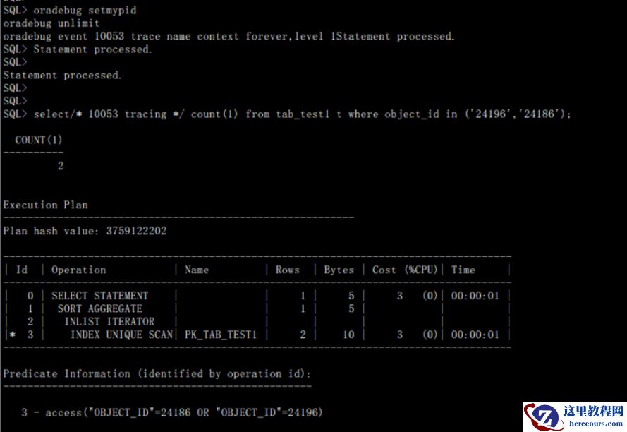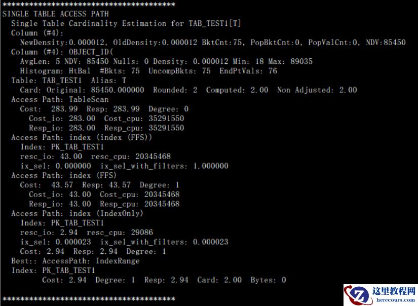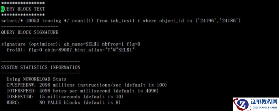 如上描述我们可以回去到如下信息:一SQL语句:select/* 10053 tracing */ count(1) from tab_test1 t where object_id in ('24196','24186');二表对象89067 ID为89067三统计信息类型采用NOWORKLOAD方式(上节有详细描述)