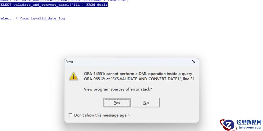 1、该函数是判断字符串是不是日期类型,编译过程没有什么报错现象。 2、执行 SELECT validate_and_convert_date('0010809') FROM dual; 时则报出了上面的ORA-14551错误。 3、而DML操作指的就是增、删、改,对比了一下自己写的其它函数,发现其它的函数都没有这个操作。 4、查看相关资料,原来这是“自治事务和主事务问题”。 5、语句中sql,包含了insert操作,虽然有commit操作但是没有事物开始。 函数如下: