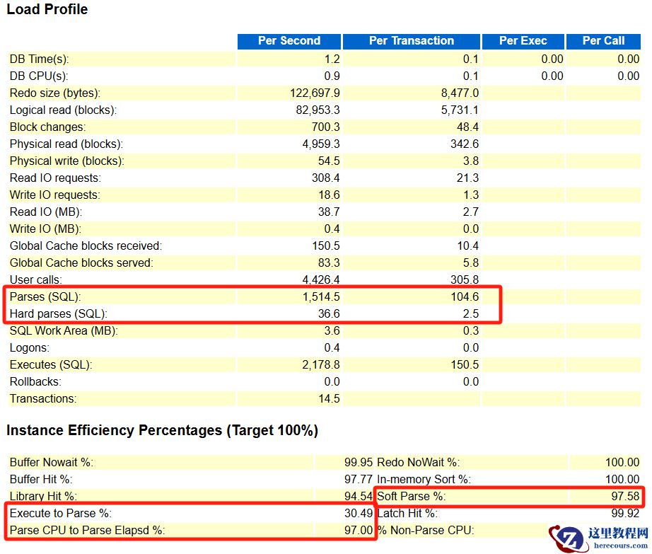 Execute to Parse% 接近 0(极差)。- 软解析率(Soft Parse%) 也接近 0%。
