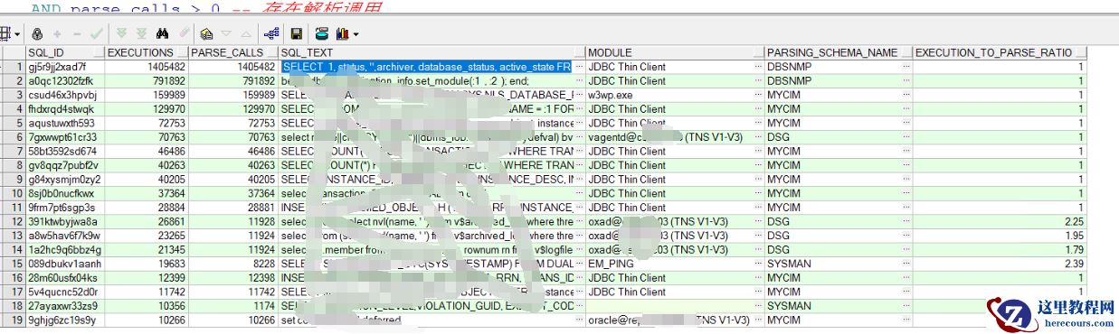 SELECT sql_id, executions, parse_calls, sql_text, module, parsing_schema_name, ROUND(executions / (parse_calls + 1), 2) AS execution_to_parse_ratioFROM v$sqlWHERE executions > 1000 -- 执行次数大于 1000(可调整) AND parse_calls > 0 -- 存在解析调用 AND executions / (parse_calls + 1) < 10 -- 执行与解析比值较低(表示未使用绑定变量)ORDER BY executions DESC;