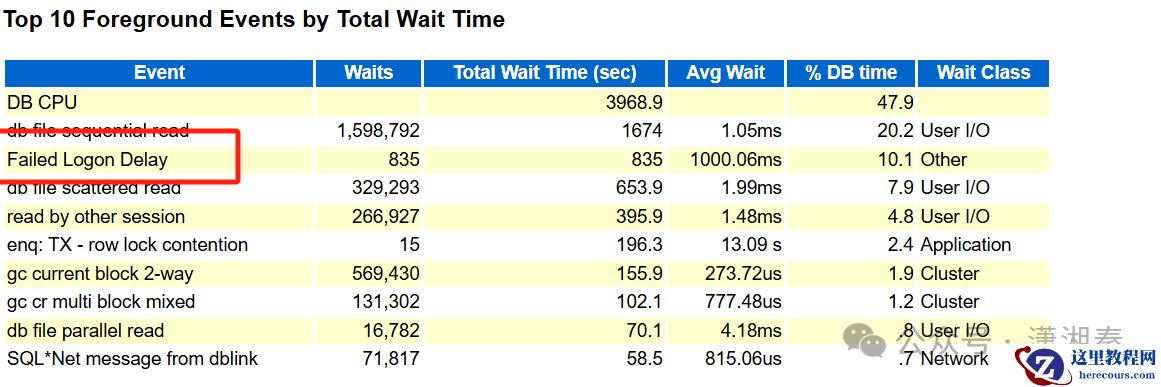 从AWR报表一眼即可看到问题的所在:Failed Logon Delay这个异常一般都是因为有自动或者定时任务的程序使用的用户名和密码错误引起的;另外还有个一个原因就是从oracle 12C开始将密码错误尝试的参数SEC_MAX_FAILED_LOGIN_ATTEMPTS 由原来的10次调整为3次,结合用户的版本就是12.2版本,那这基本就是问题的所在了;