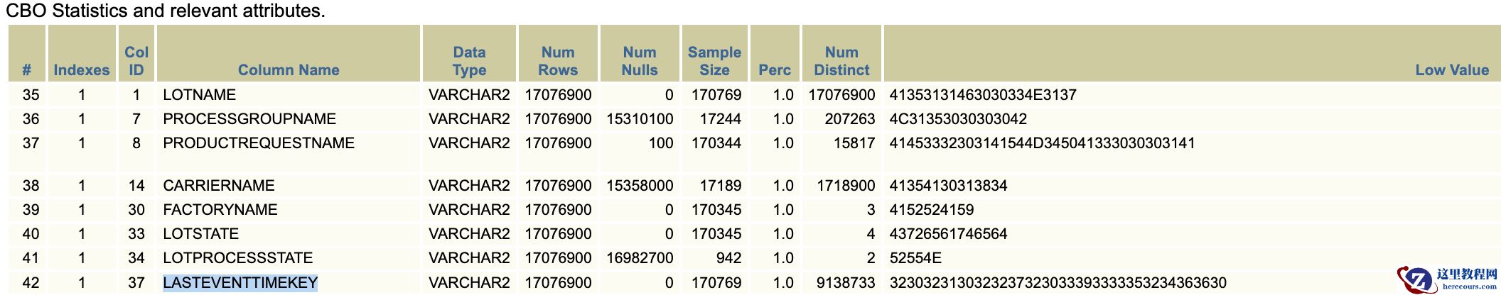 TABLE_NAME COLUMN_NAME NUM_DISTINCT HIGH_VALUE LOW_VALUE DENSITY NUM_NULLS