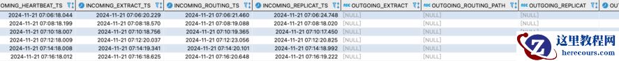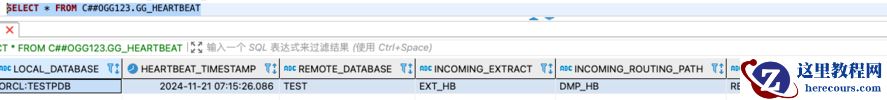 先登录pdb GGSCI (rm-bp1d69973r39876n9ko.mysql.rds.aliyuncs.com) 1>dblogin userid c##ogg123@testpdb password ogg123 添加心跳 GGSCI (rm-bp1d69973r39876n9ko.mysql.rds.aliyuncs.com as c##ogg123@orcl/TESTPDB) 16> ADD HEARTBEATTABLE, frequency 120, retention_time 10, purge_frequency 2 2024-11-21 15:05:24 INFO OGG-14001 Successfully created heartbeat seed table ""c##ogg123"."GG_HEARTBEAT_SEED"". 2024-11-21 15:05:24 INFO OGG-14032 Successfully added supplemental logging for heartbeat seed table ""c##ogg123"."GG_HEARTBEAT_SEED"". 2024-11-21 15:05:24 INFO OGG-14000 Successfully created heartbeat table ""c##ogg123"."GG_HEARTBEAT"". 2024-11-21 15:05:25 INFO OGG-14033 Successfully added supplemental logging for heartbeat table ""c##ogg123"."GG_HEARTBEAT"". 2024-11-21 15:05:25 INFO OGG-14016 Successfully created heartbeat history table ""c##ogg123"."GG_HEARTBEAT_HISTORY"". 2024-11-21 15:05:25 INFO OGG-14086 Successfully disabled partitioning for heartbeat history table c##ogg123.gg_heartbeat_history. 2024-11-21 15:05:25 INFO OGG-14023 Successfully created heartbeat lag view ""c##ogg123"."GG_LAG"". 2024-11-21 15:05:25 INFO OGG-14024 Successfully created heartbeat lag history view ""c##ogg123"."GG_LAG_HISTORY"". 2024-11-21 15:05:25 INFO OGG-14003 Successfully populated heartbeat seed table with "ORCL:TESTPDB". 2024-11-21 15:05:26 INFO OGG-14004 Successfully created procedure ""c##ogg123"."GG_UPDATE_HB_TAB"" to update the heartbeat tables. 2024-11-21 15:05:26 INFO OGG-14017 Successfully created procedure ""c##ogg123"."GG_PURGE_HB_TAB"" to purge the heartbeat history table. 2024-11-21 15:05:26 INFO OGG-14005 Successfully created scheduler job ""c##ogg123"."GG_UPDATE_HEARTBEATS"" to update the heartbeat tables. 2024-11-21 15:05:26 INFO OGG-14018 Successfully created scheduler job ""c##ogg123"."GG_PURGE_HEARTBEATS"" to purge the heartbeat history table.