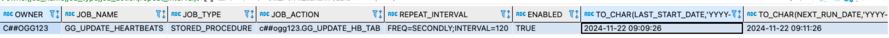 select owner,job_name,job_type,job_action,repeat_interval,enabled,to_char(last_start_date,'yyyy-mm-dd hh24:mi:ss'),to_char(next_run_date,'yyyy-mm-dd hh24:mi:ss') from dba_scheduler_jobs WHERE job_NAME='GG_UPDATE_HEARTBEATS' AND owner='C##OGG123';