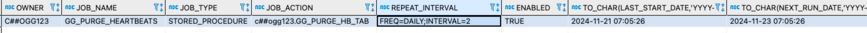 select owner,job_name,job_type,job_action,repeat_interval,enabled,to_char(last_start_date,'yyyy-mm-dd hh24:mi:ss'),to_char(next_run_date,'yyyy-mm-dd hh24:mi:ss') from dba_scheduler_jobs WHERE job_NAME='GG_PURGE_HEARTBEATS' AND owner='C##OGG123';