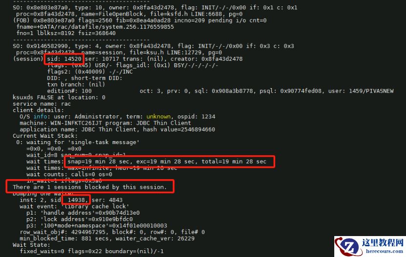 同时数据库 diag trace日志也显示了上面相关会话之间的阻塞关系,如下:
