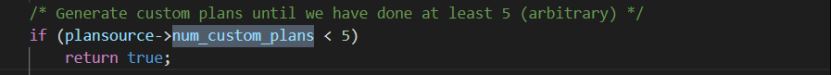 5次,返回true,选择custom执行计划,而大于5次之后,则选择通用执行计划。因此,5次之后执行计划就会固定。