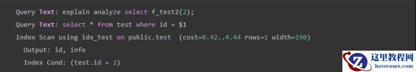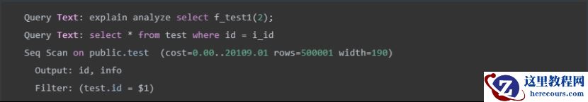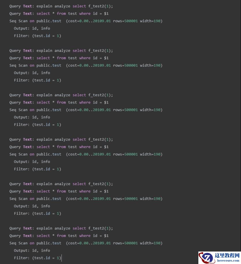 5次都是“Filter: (test.id = 1)”,而第6次变成了“Filter: (test.id = $1)”,这说明执行计划变成了通用执行计划,并使用绑定变量,这时把值改成“2”,发现也是走全表扫描,不走索引。