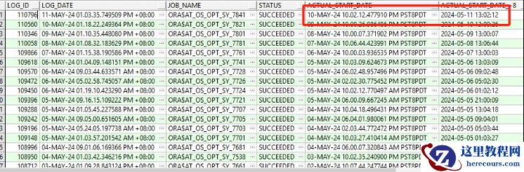select t.log_id, t.LOG_DATE, t.JOB_NAME, t.STATUS, t.ACTUAL_START_DATE, to_char((to_timestamp_tz(ACTUAL_START_DATE) at time zone '+08:00'), 'yyyy-mm-dd hh24:mi:ss') "ACTUAL_START_DATE_+8", t.RUN_DURATION, t.con_id from cdb_scheduler_job_run_details t where job_name LIKE 'ORA$AT_OS%' and con_id = 3 order by log_date;
