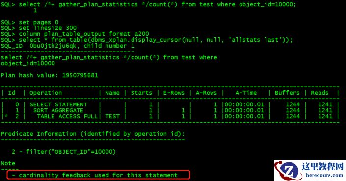 从图中可以看出,当前已经关闭动态采样,第一次执行 SQL 时, E-Rows 1014 与 A-Rows 1 相差过大,当第二次执行时,可以看出相差很小,说明发生了基数反馈 cardinality feedback ,也就是 CBO 考虑了上次执行获取的 cardinality ( cardinality feedback used for this statement )。