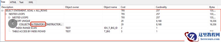 select * from t_big where id in (select * from table(UDT_INTTABLE(1,2,3,4,5,6,7,8,9,10,100))),执行计划如上。